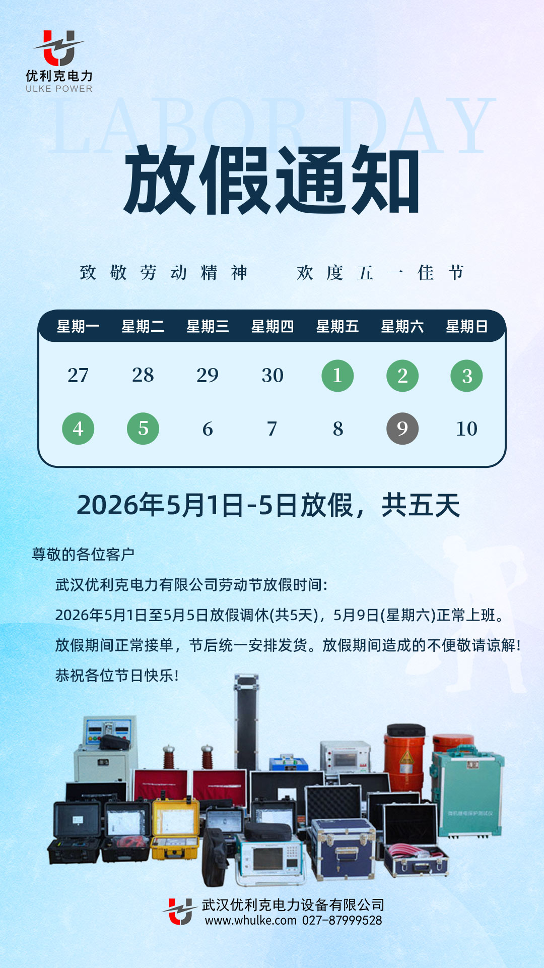 一直以來,感謝您對武漢優利克電力的支持與信任。我們將一如既往地為您提供優質的產品和服務。因放假給您帶來的不便,