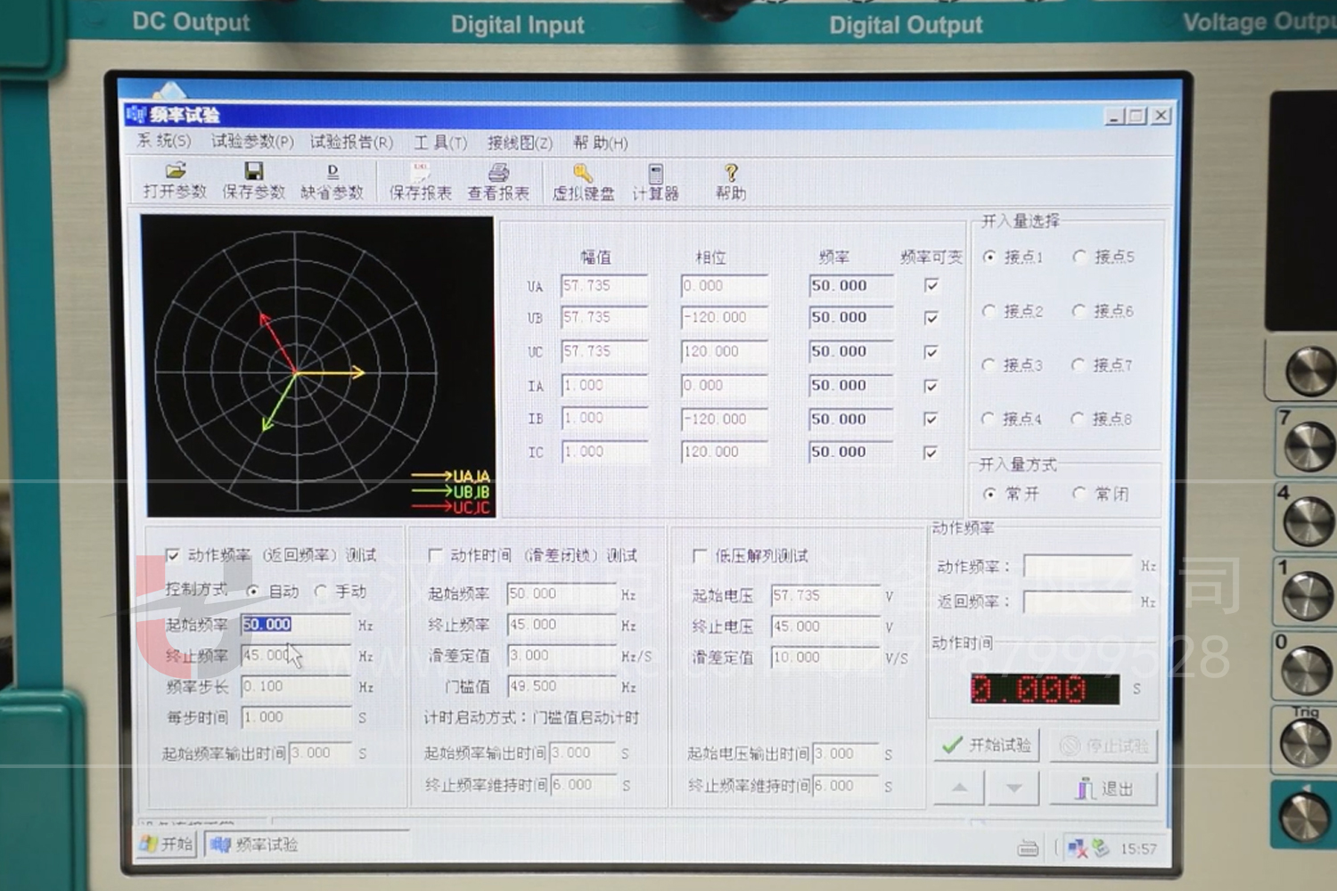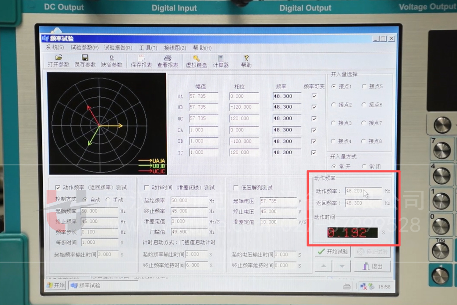 觀察裝置是否按預設定值(動作頻率、返回頻率、動作延時等)準確動作,以此驗證頻率保護的 “選擇性、速動性、靈敏性、可靠